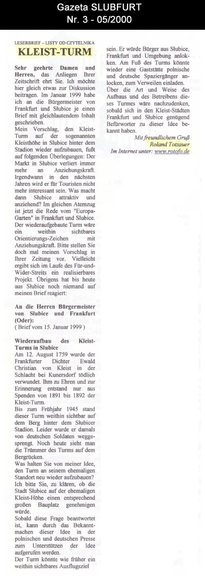 In Slubice soll ein neuer Kleistturm entstehen: | ||||||||||||